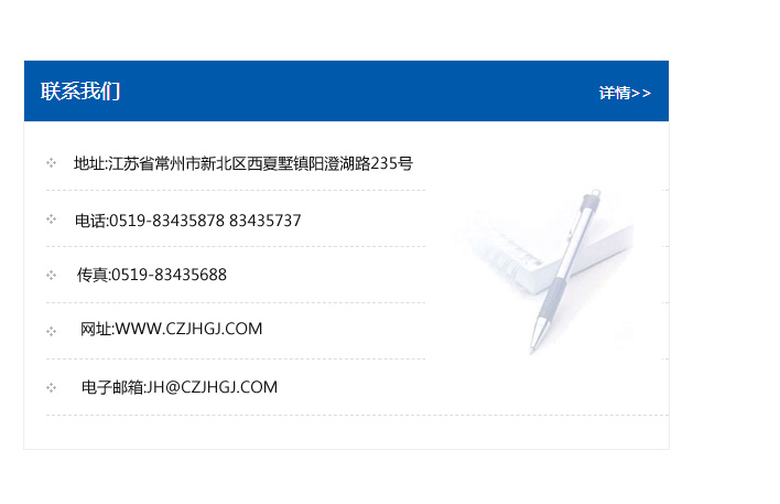 地址:常州市新北區友邦商務大廈1幢16、17層  電話:0519-85101652  傳真:0519-85112595  郵編:213022  網址:www.cz-jiayue_cn.njljtg.com  郵箱:xiajifengaa@163.com